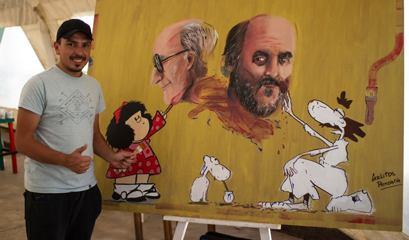Asimismo, este joven artista local, contó, “me contactaron varias veces del Municipio para hacer distintos trabajos. En este caso, lo que estoy haciendo actualmente, es pintar las garitas de refugio de quienes usan los colectivos urbanos de la ciudad. Y, mientras a la gente le guste, voy a seguir haciéndolo. Además de las que ya hice, me quedan otras para intervenir y seguiremos con los personajes que me pidieron y que cree para este trabajo”.
