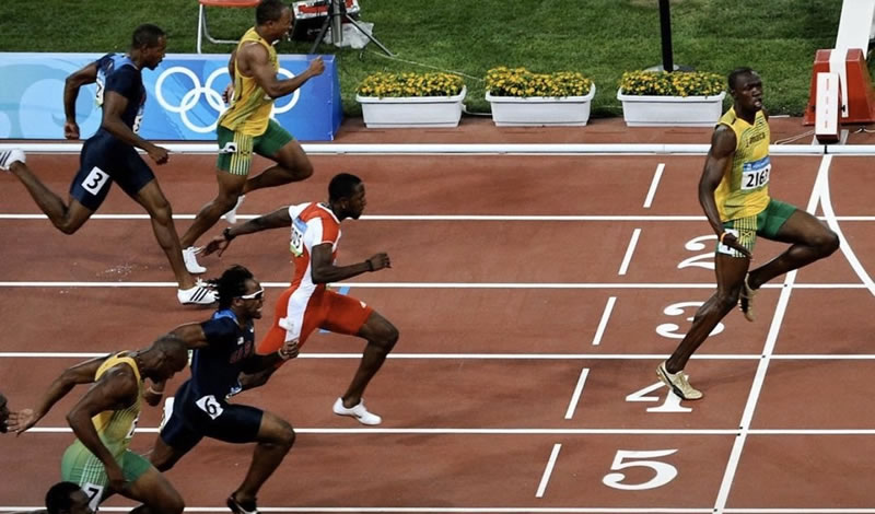 La foto refleja el particular «social distancing» que Bolt mantenía en su mejor época con sus rivales en pista.