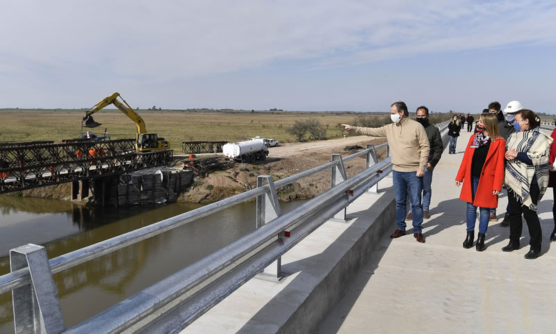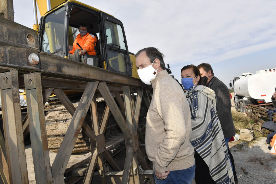 Junto a la vicegobernadora Laura Stratta y al presidente de Junta de Gobierno de la localidad, Carlos Ostorero, el gobernador recorrió la obra donde actualmente ya están habilitados los puentes de hormigón nuevos, uno de 100 metros de largo y el otro de 80 metros, y restan finalizar las obras complementarias.