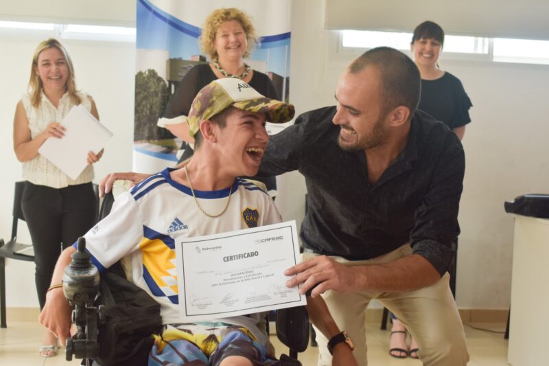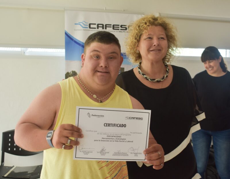 La vocal de la Comisión Administradora para el Fondo Especial de Salto Grande, Celeste Lorenz, junto al intendente local, Ricardo Bravo, participaron del cierre de los talleres de discapacidad “Herramientas y estrategias para la inserción en la vida social y laboral” dictados durante este año. También participaron la vice intendenta, Corina Rollano, y la titular del Área de Discapacidad de la Municipalidad de Federación, Mónica Panozzo.