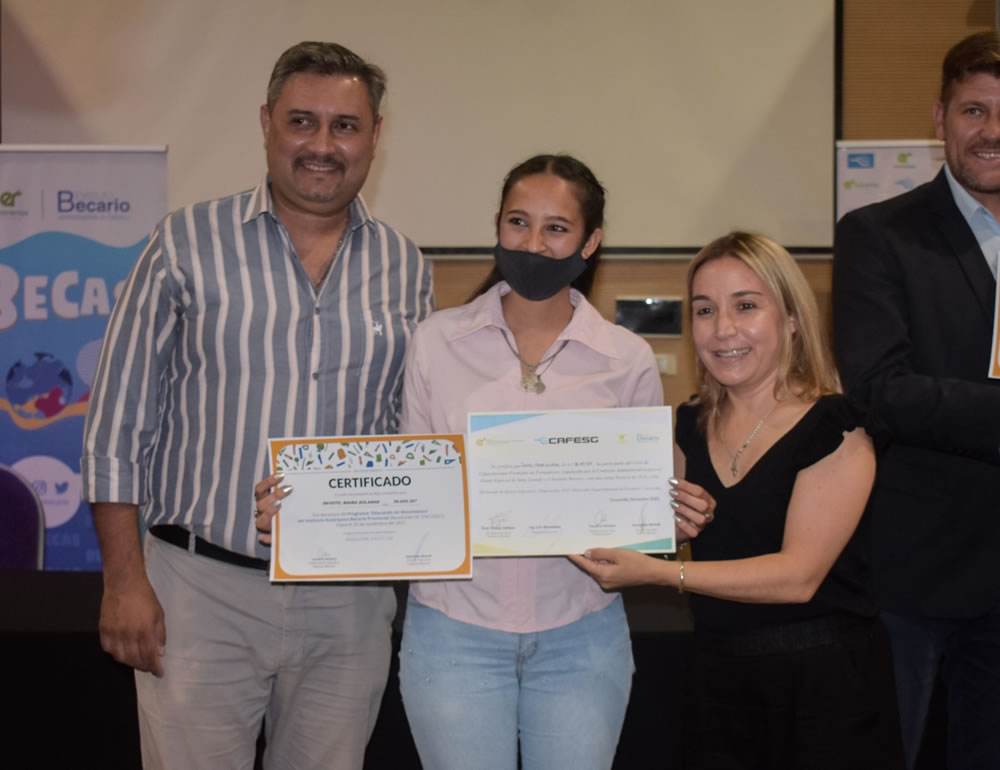Junto al director del Becario, Sebastián Bértoli y la vocal de CAFESG, Celeste Lorenz; estuvieron el intendente de Concordia, Alfredo Francolini; el director Departamental de Escuelas de Concordia, Fabián Vallejos; la subdirectora del Becario, Carolina Amiano y la coordinadora del programa en CAFESG, Soledad Siegrist.