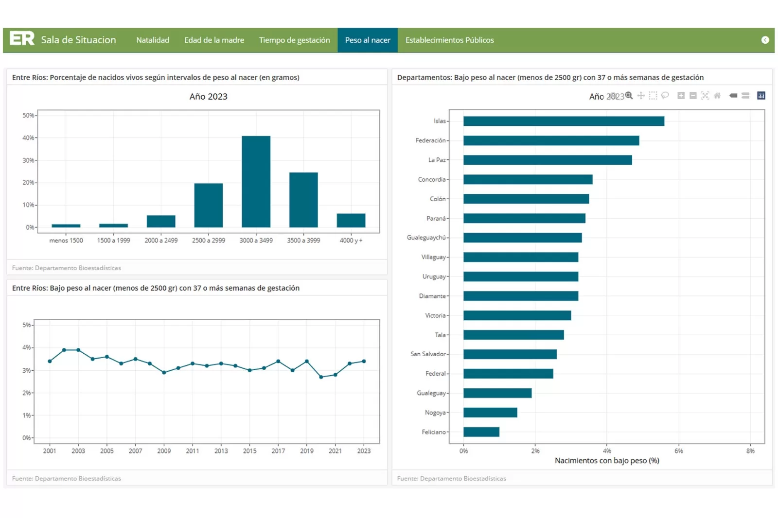 La herramienta también incluye detalles sobre el porcentaje de nacimientos en Establecimientos Públicos por Departamento de residencia, e indicadores como la edad gestacional y el peso al nacer.
