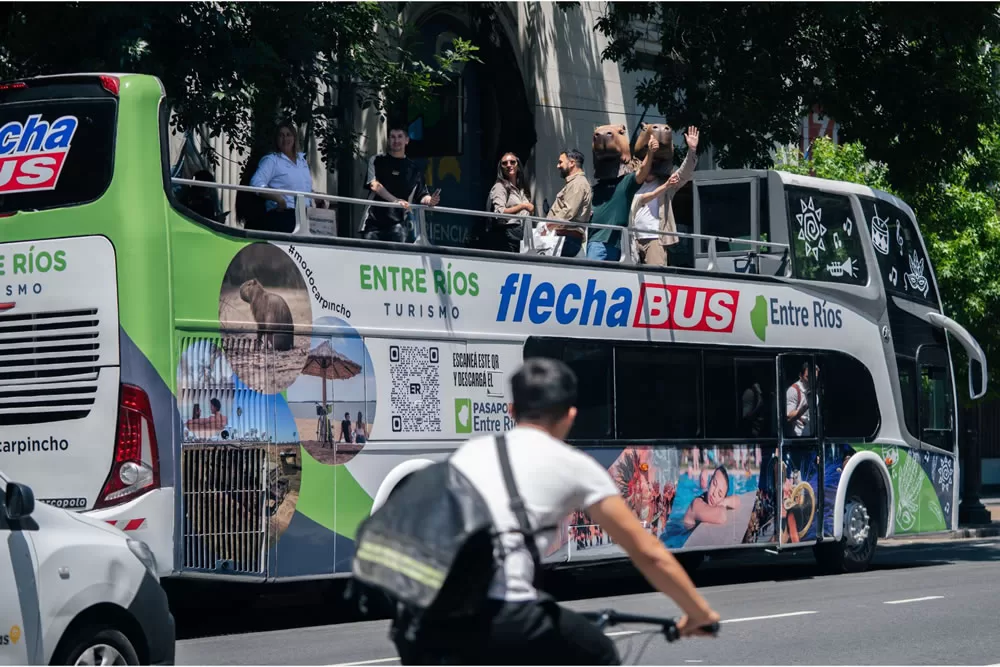 A bordo de un colectivo de Flecha Bus, ploteado con la campaña “Carpincheá tu verano en Entre Ríos”, El Carpincho interactuó con vecinos y turistas. Posó para selfies, protagonizó escenas espontáneas y generó un clima festivo que facilitó el contacto directo con el público. Gracias a esta dinámica, los promotores distribuyeron merchandising y ofrecieron información detallada sobre destinos, parques nacionales, experiencias termales, espectáculos y actividades al aire libre.