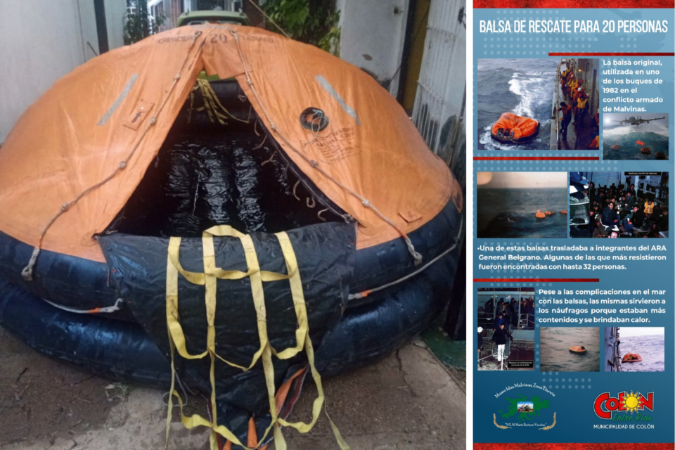“Una de estas balsas trasladaba a integrantes del ARA General Belgrano. Algunas de las que más resistieron fueron encontradas con hasta 32 personas. Pese a las complicaciones en el mar con las balsas, las mismas sirvieron a los náufragos porque estaban más contenidos y se brindaban calor. Una de estas balsas fue donada al Museo Zona Darwin y se expondrá en Colón después de 41 años en la plazoleta de Malvinas y en el acto del 2 de abril”, cuenta Mario Vaucher ex combatiente a cargo del Museo.