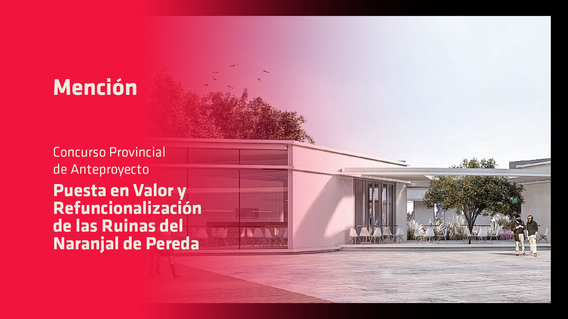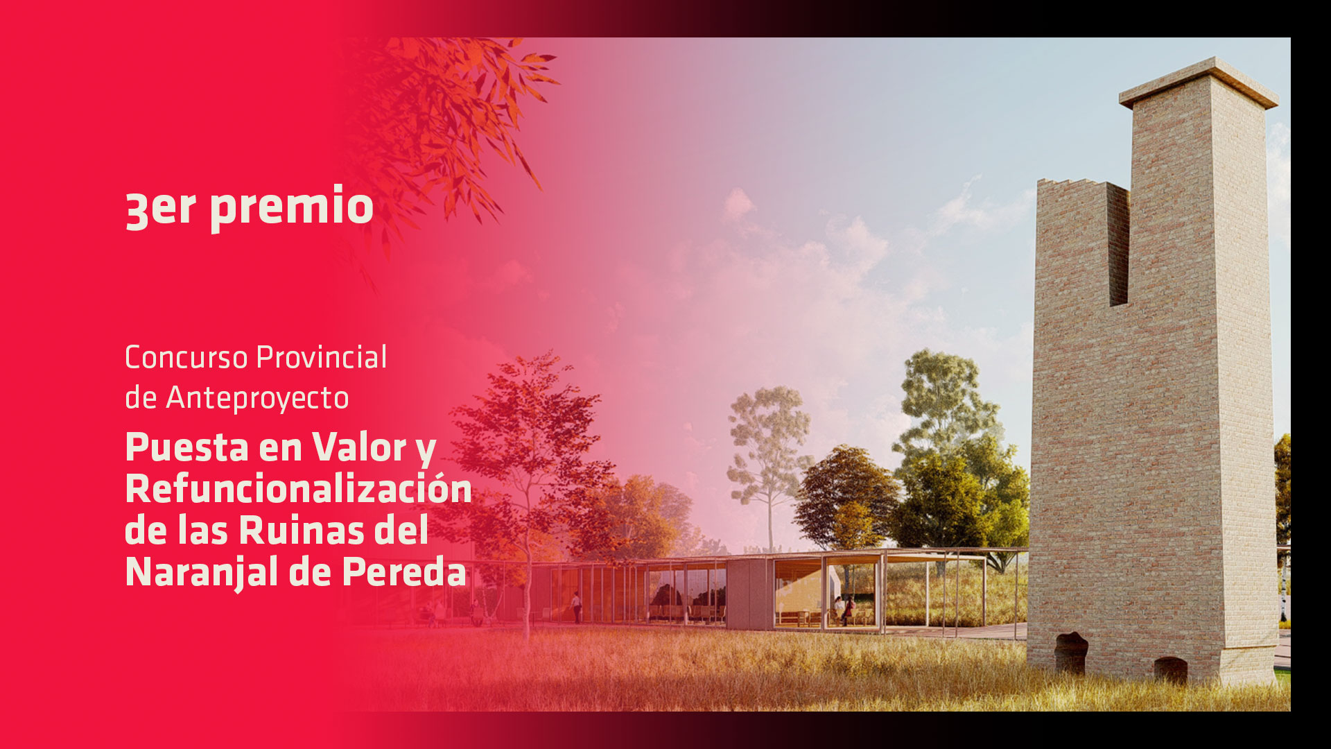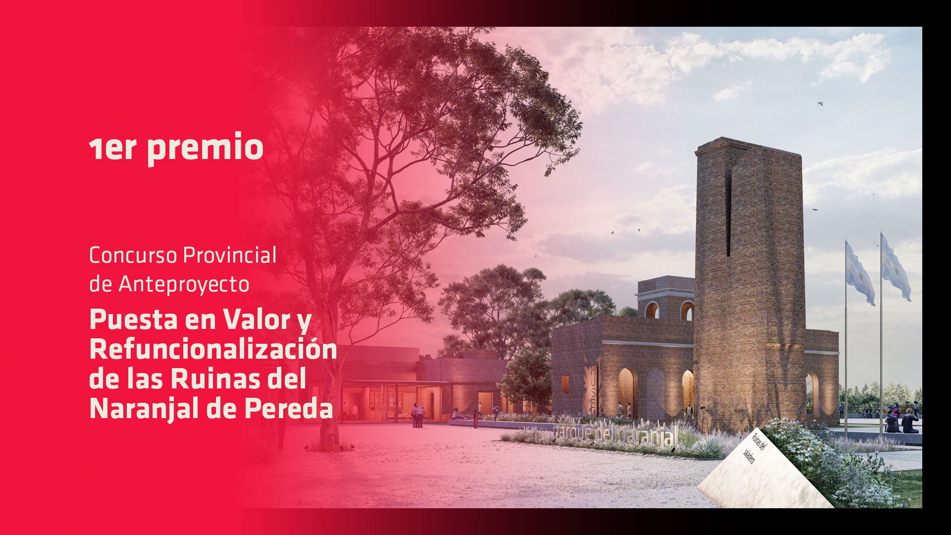 El próximo viernes 3 de noviembre se realizará la entrega de premios a los/as ganadores/as del Concurso Provincial de Anteproyectos para la “Puesta en Valor y Refuncionalización de las Ruinas del Naranjal de Pereda”, ubicado en la ciudad de Concordia, y la correspondiente muestra de las propuestas que se presentaron al certamen.