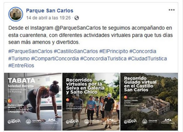 Otra propuesta muy interesante sucede en los perfiles en Instagram del Parque San Carlos y de la Costanera de Concordia, áreas dependientes de la Secretaría de Desarrollo Económico y Turismo, en el que diariamente hay diferentes actividades, como clases de fotografía, crossfit, bachata, cocina, recorridos virtuales por el Castillo o por la selva en galería, entre muchas otras opciones.