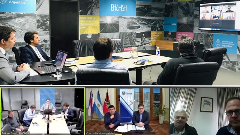 El administrador del Ente Nacional de Obras Hídricas de Saneamiento Enrique Cresto y el intendente Alfredo Francolini encabezaron este jueves una reunión mediante teleconferencia para avanzar en la firma de los convenios específicos que impulsarán la puesta en marcha de las obras de ampliación de redes cloacales en los barrios Isla Maciel, Llamarada, Las Viñas, San Juan y Parque, a través del programa nacional Argentina Hace.