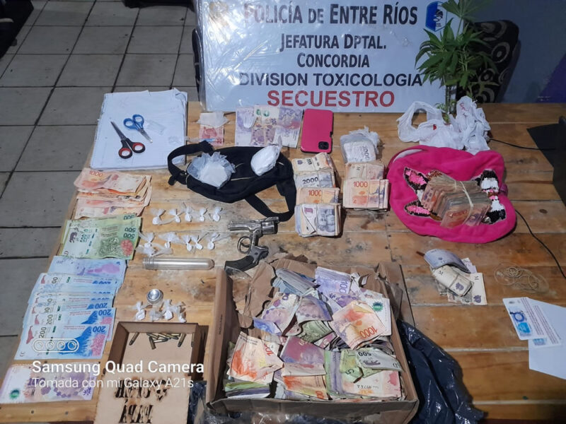 Asimismo se procedió al secuestro de 104 grs. de cocaína distribuidos en trozos compactos y en envoltorios, un arma de fuego cal.32; cartucherías varias de distintos calibres, tres teléfonos celulares, una notebook, cuaderno de anotaciones, elementos de corte y fraccionamiento, balanza portátil, la suma de casi $800.000 en moneda nacional y plantines de cannabis.
