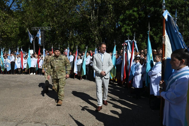 El acto continuo con el izamiento del pabellón nacional y la entonación del Himno Nacional, la Marcha de Entre Ríos y la Marcha de las Malvinas. Además de las ofrendas florales que, una a una fueron colmando el Monumento a los Caídos.