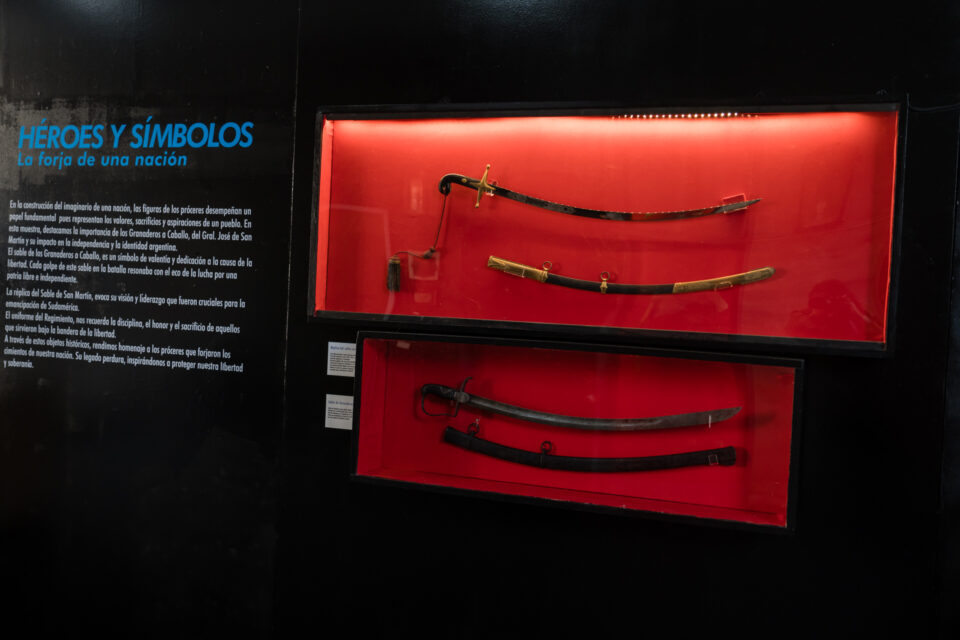 Entre los objetos exhibidos, se encuentra el sable usado por los granaderos que se remarca como un símbolo de valentía y dedicación a la causa de la libertad. También una réplica del sable de San Martín, que «con su brillo inquebrantable, evoca la figura del Libertador, cuya visión y liderazgo fueron cruciales para la emancipación de Sudamérica. San Martín no solo empuñó este sable en numerosas batallas, sino que también lo utilizó como una herramienta de esperanza y determinación para guiar a sus soldados hacia la victoria», se informa. Otra pieza es el uniforme del Regimiento de los Granaderos a Caballo, que con «su elegancia y distinción, es un recordatorio de la disciplina, el honor y el sacrificio de aquellos que sirvieron bajo la bandera de la libertad», se expresa desde la organización de la muestra.