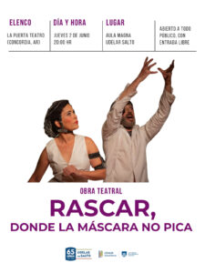 La obra «Rascar, donde la máscara no pica», de autoría de Patricia Velzi, se presentará en Salto en estreno para Uruguay, en una función abierta a todo público y con entrada gratuita.