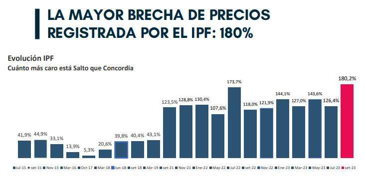 La brecha de precios entre Salto y Concordia en la medición de septiembre de 2023 se amplía 43% respecto a la medición anterior y se ubica en el máximo valor registrado, a pesar de la inflación registrada en Argentina.