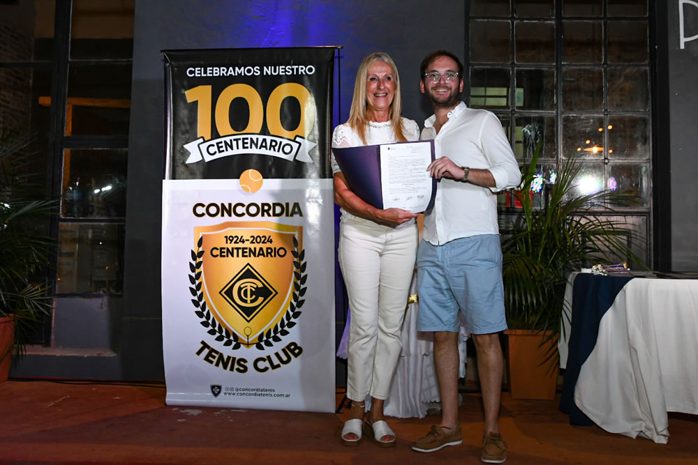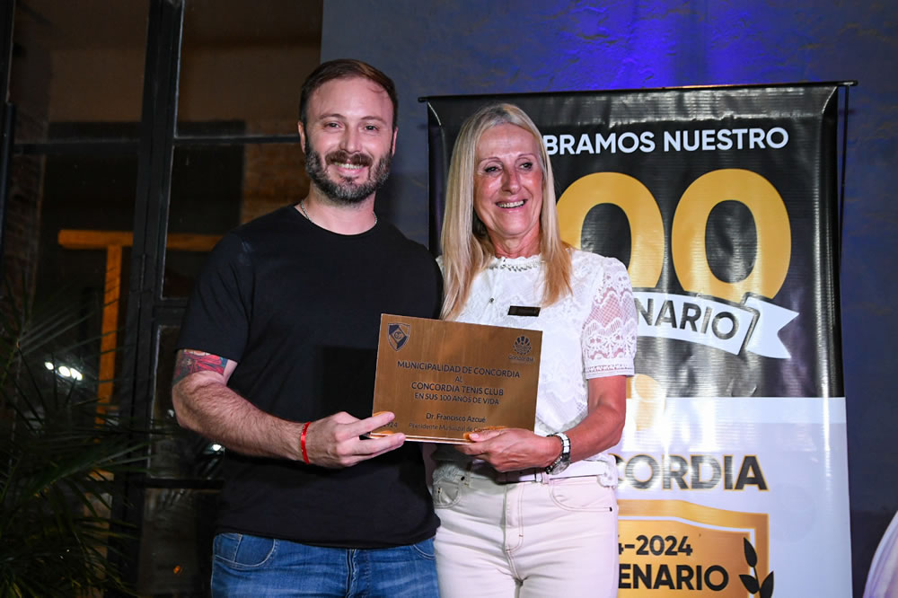 “Por eso los felicito por este aniversario y los aliento a que sigan trabajando en el crecimiento del Concordia Tenis Club y de nuestra ciudad”, enfatizó luego. Cabe destacar que, en nombre de la ciudad, entregó a la presidente una placa recordatoria del Centenario.