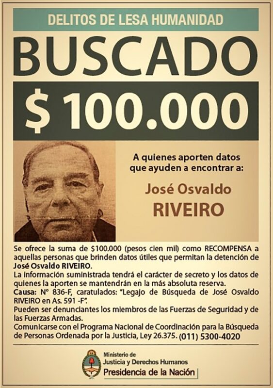 La recompensa que se ofrecía por el coronel José Osvaldo Riveiro, militar del Batallón 601 y contacto de Arancibia Clavel en Buenos Aires.