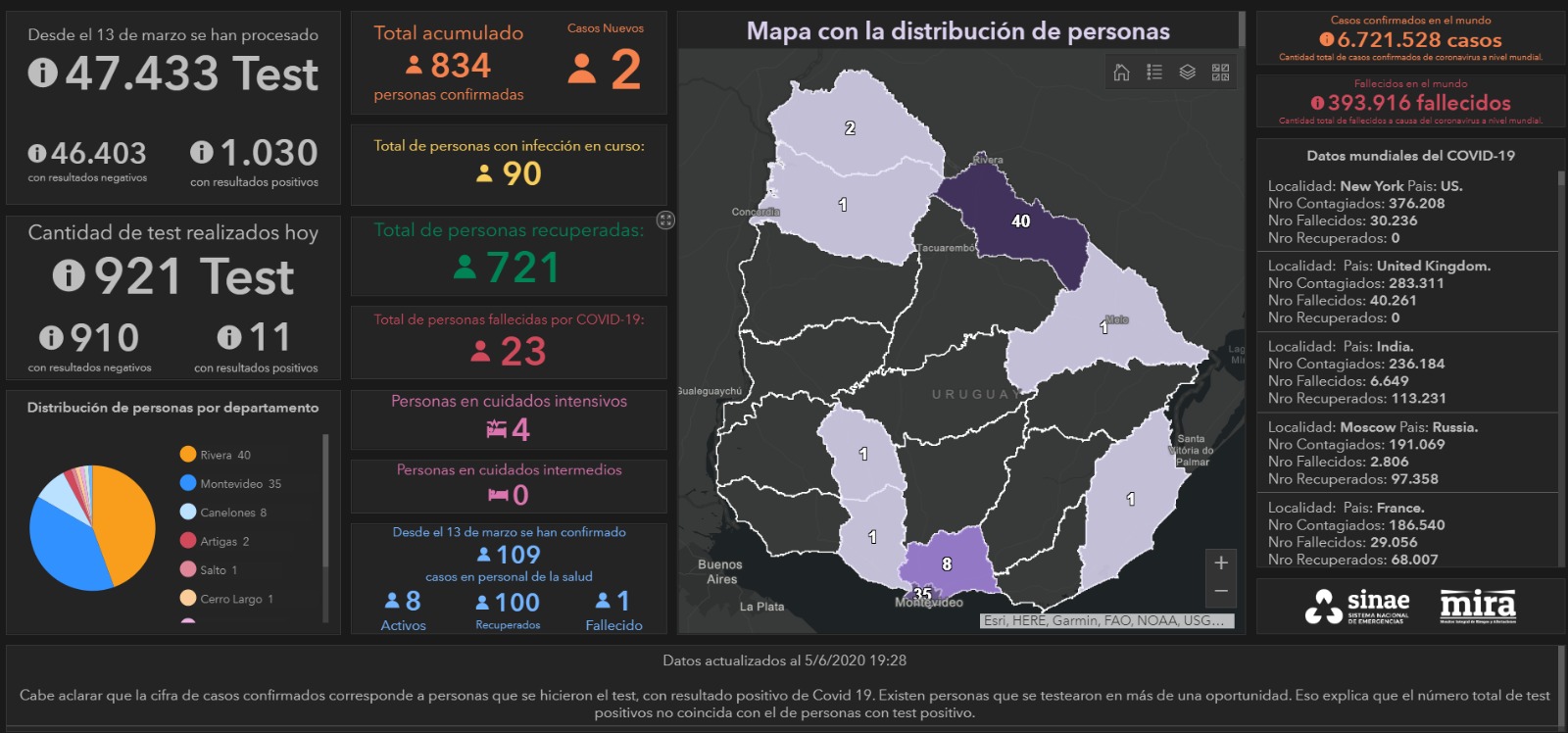 Los departamentos con casos activos son Artigas, Canelones, Cerro Largo, Flores, Montevideo, Rivera, Rocha.