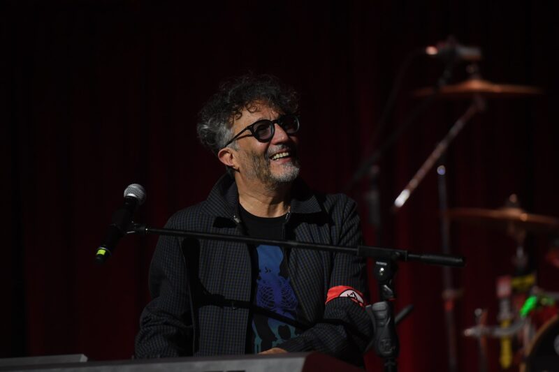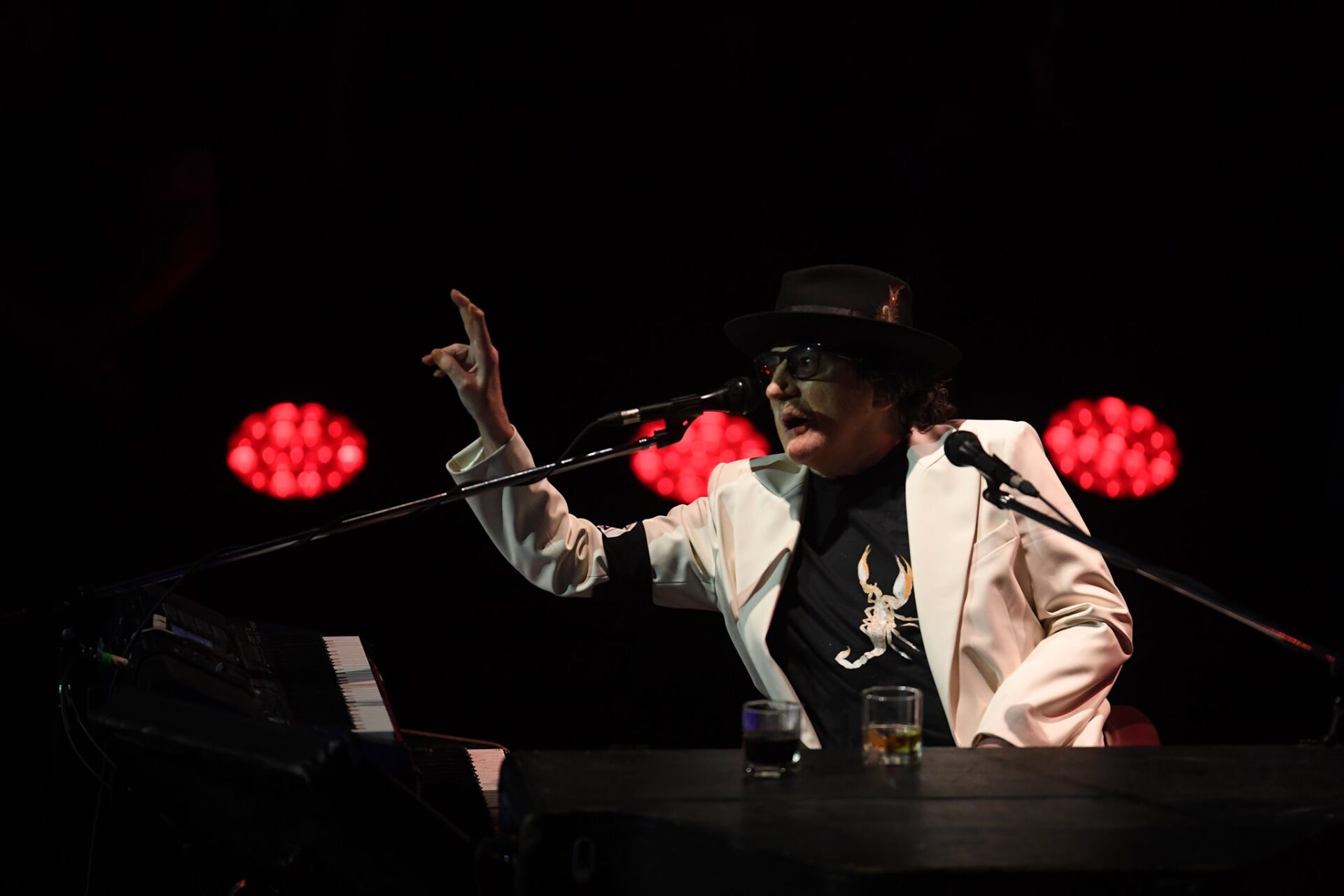 El gran rockstar argentino apareció sin aviso previo para cantar un rabioso «Cerca de la revolución», al que siguió «Promesas sobre el bidet» y «Raros peinados nuevos», en impagables versiones, en las que cantó sentado a los teclados.