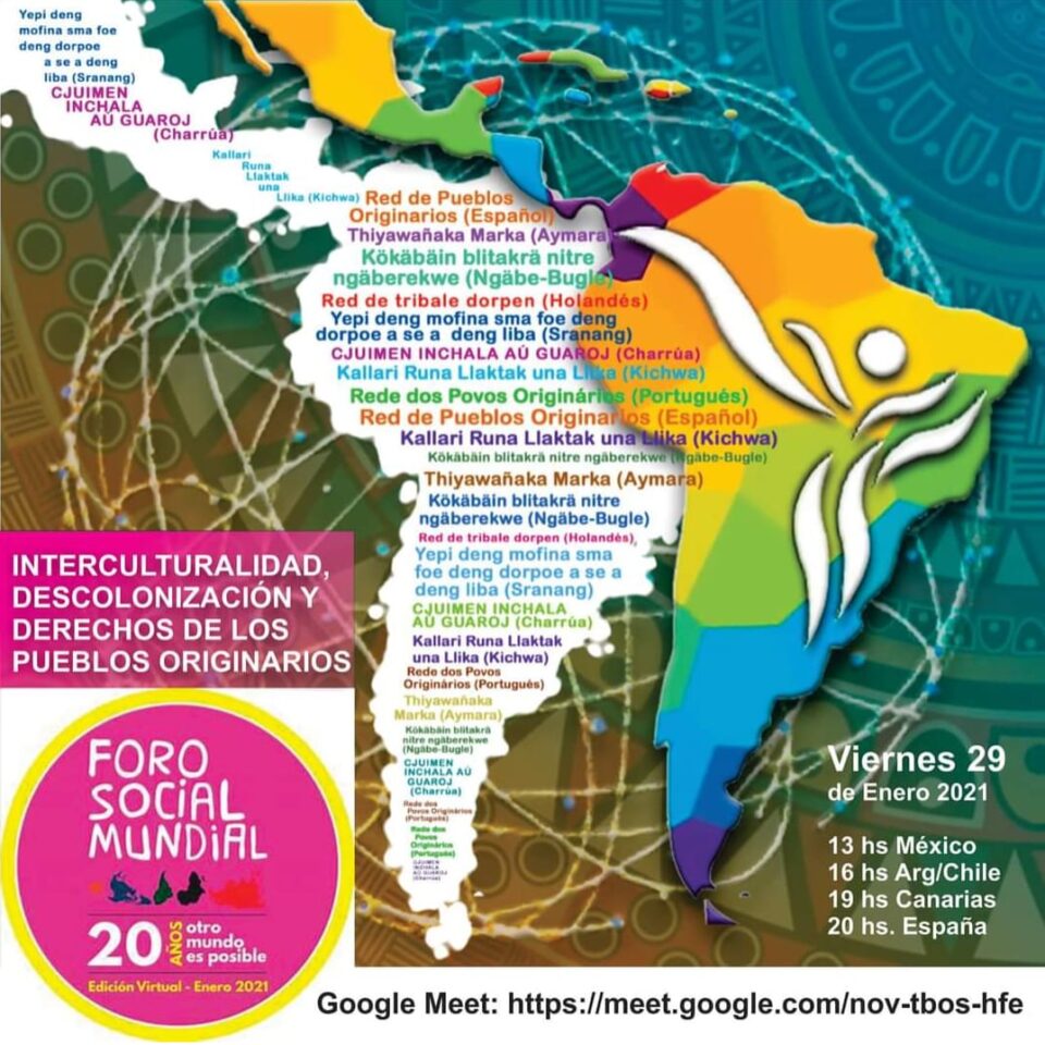 La Red de Pueblos Originarios del 5to Foro Humanista Latinoamericano, este viernes 29 de enero participará del Foro Social Mundial 2021 con un Conversatorio denominado «Interculturalidad, Descolonización y Derechos de los Pueblos Originarios», con disertantes de Argentina, México e Is. Canarias, en el cual se expondrán algunas descripciones de la situación actual de los Pueblos Originarios de distintas regiones de Latinoamérica y las Islas Canarias, como así también algunas propuestas que se han comenzado a elaborar en el marco del 5to. Foro Humanista Latinoamericano para compartirlas y ampliarlas en ocasión del FSM 2021, dándole continuidad y amplitud a los aspectos abordados por la Red.