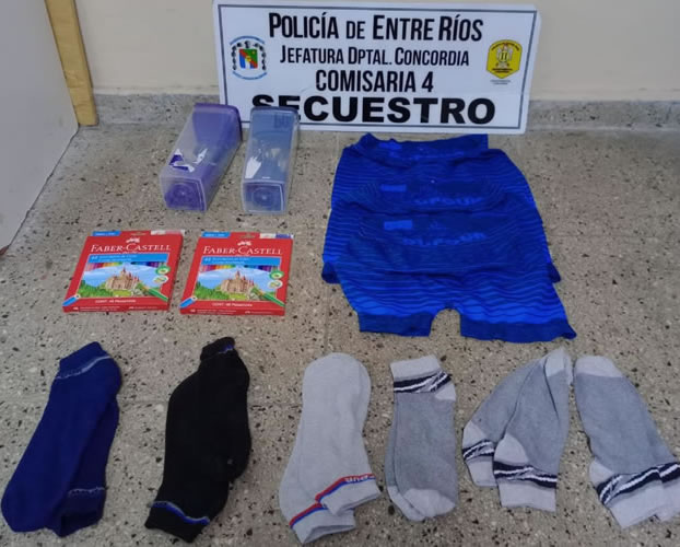 Se constató que tenía en su poder elementos varios: útiles escolares y prendas de vestir. El personal policial procedió a la detención del masculino, por orden del fiscal en turno, quien también dispuso la devolución de los elementos al encargado del local.