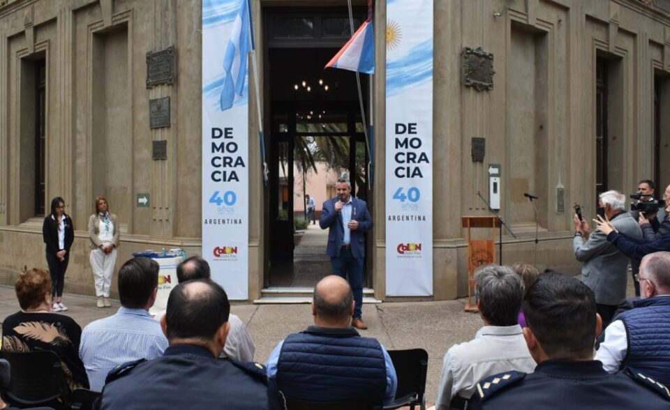 Este lunes 30 de octubre, al celebrarse 40 años de la recuperación de la Democracia Argentina, tuvo lugar un acto en el frente del edificio municipal de Colón que estuvo presidido por el Intendente José Luis Walser.