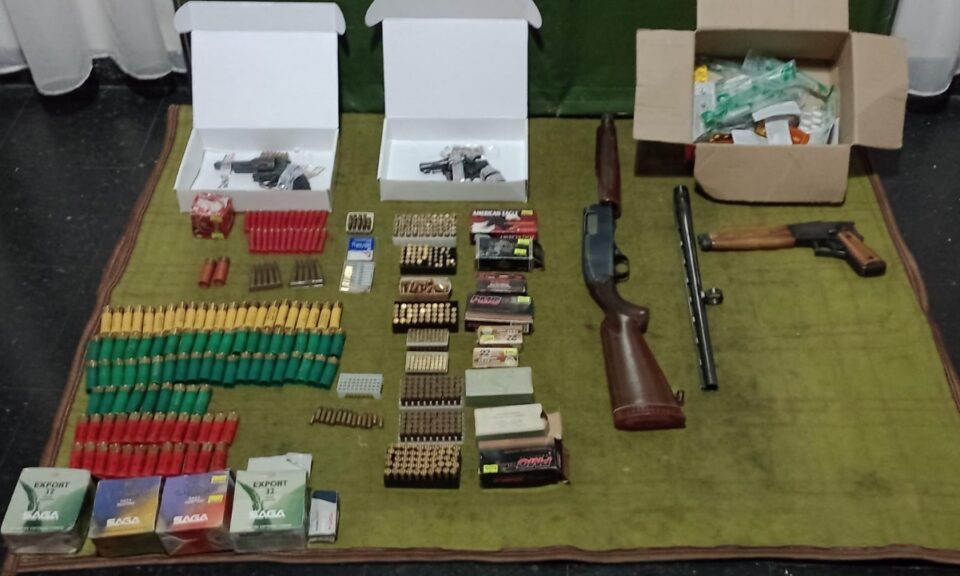Y también se incautaron seis armas de fuego de diferentes calibres (9 mm, 22 mm, 32 mm), una escopeta y un pistolón; 618 cartuchos de 9 mm, 22 mm, 32 mm, 7,65 mm, 16/70, 12/70; teléfonos celulares, computadoras, pen drives y elementos de interés.
