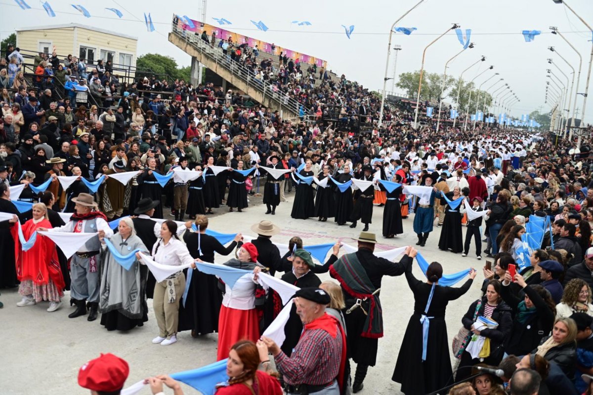 Uno de los momentos más esperados fue el tradicional desfile de organizaciones tradicionalistas por la pasarela del Corsódromo, que evocó el orgullo por las raíces culturales del país. Luego, más de 2.000 personas participaron del Vals de Gualeguaychú y del pericón más grande del mundo, dos expresiones populares que cada año convocan a vecinos y visitantes a bailar al compás del sentimiento patrio.
