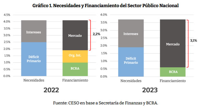 Este año, el Gobierno podría obtener hasta un 2% del PBI financiado por el BCRA de acuerdo a la Carta Orgánica. Sin embargo, en el acuerdo con el Fondo se limitaría a 1%. Esto obliga a que se consigan otras fuentes de financiamiento. La yapa que mencionamos de otros organismos internacionales aporta un 0,9% del PBI. Por lo tanto, queda por encontrar financiamiento extra en el mercado privado a través de licitaciones por 2,2% del PBI este año y por 3,1% del PBI el año que viene (ver Gráfico 1).