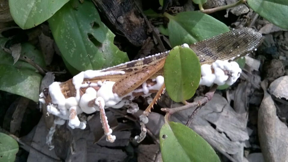 Uno de los proyectos más avanzados dentro del mismo grupo es el de Sebastián Pelizza, investigador del CONICET dedicado al desarrollo de un insecticida biológico contra la langosta migratoria, una plaga que arrasa con todo tipo de cultivos y vegetales, y que llega a formar mangas de hasta 25 kilómetros de frente y de 5 a 10 de profundidad. Con apariencia de nube gigantesca, se trasladan a lo largo de distintas provincias y cada vez que descienden para alimentarse dejan el terreno absolutamente pelado, incluidas las hojas de los árboles. El formulado –que se encuentra en fase de prueba– está desarrollado a base de conidios de un hongo y se aplica por rociamiento. Cuando toma contacto con la superficie del insecto, germina sobre la cutícula que lo recubre y penetra hacia su interior, invadiendo los sistemas respiratorio, circulatorio y digestivo hasta producir la muerte.