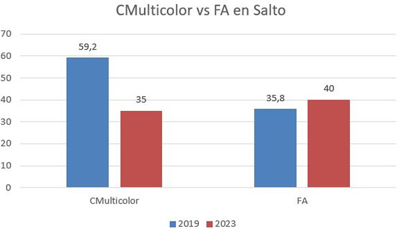 El bloque de la coalición multicolor logró en la primera vuelta de 2019 en Salto más del 59% de los votos, mientras que el FA el 35%. En este momento el bloque de la CM está cerca del 36% y el FA en el 40%, como dijimos antes, será importante la decisión que tomen quienes hoy no están manifestando preferencias electorales, así como también los movimientos interbloques que se podrían generar. Recordemos que para la primera vuelta faltan casi 11 meses.