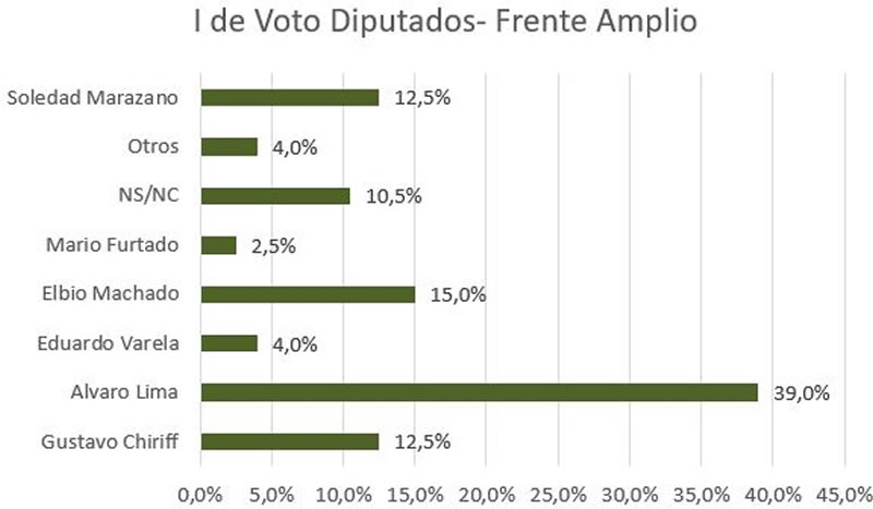 El actual diputado, que podría ir por su reelección, Álvaro Lima, aparee con una intención de voto del 39%. En segundo lugar aparece el nombre del actual director de Obras de la Intendencia de Salto, Elbio Machado, con un 15% de la intención de voto. El tercer lugar es compartido por el actual secretario general de la Intendencia de Salto, Gustavo Chiriff, y la actual directora de Promoción y Desarrollo de la Intendencia, Soledad Marazzano, con un 12,5% de las menciones. Luego aparecen dos figuras que también ocupan cargos en el actual gobierno departamental, tanto Eduardo Varela como Mario Furtado consiguen registros en esta grilla. Debemos mencionar que si sumamos los que mencionan «otros» nombres y quienes no manifiestan una decisión tenemos casi el 15% de los electores del Frente Amplio.