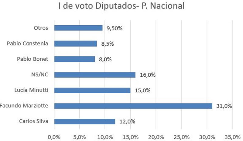 Los nombres que surgen en la lista también ocupan diferentes cargos aunque en organismos muy diferentes: quien encabeza la lista de preferencias en Facundo Marziote con el 31% de la intención de voto, ocupa una banca en la Junta Departamental de Salto. Como vemos hay un grupo muy compacto de posibles candidaturas con una intención de voto que muestra niveles similares, Lucía Minutti (ASSE) con un 15% y Carlos Silva (Salto Grande) con un 12% aparecen en posiciones intermedias. Luego surgen los nombres de Pablo Constenla (ex Salto Grande) y Pablo Bonet (Junta Departamental de Salto) con guarismos del entorno del 8%. En el caso del Partido Nacional casi un 10% de quienes votarían mencionan «otras» posibles candidaturas pero ninguna llega al umbral del 1% de los posibles votos y finalmente también aquí tenemos un elevado número de indecisos, ellos son un 16% de quienes votarían al Partido Nacional.
