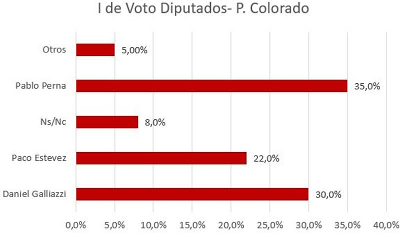Quien actualmente encabeza la lista es Pablo Perna, dirigente que ocupó hasta hace un tiempo el cargo de secretario general del Partido Colorado local y que desde allí mantuvo duros cruces con el Senador Germán Coutinho en diferentes temas de la agenda. En segundo lugar aparece Daniel Galliazzi, quien en el anterior ciclo electoral obtuviera una interesante performance electoral y que aún no ha dado señales claras de si en esta oportunidad asumirá una candidatura o no. En tercer lugar aparece el actual diputado, y que seguramente disputará su reelección, Paco Estévez, con el 22% de la intención de voto. En el Partido Colorado los que mencionan «otras» candidaturas son el 5% de su posible electorado y los que aún no manifiestan una posición son el 8%.