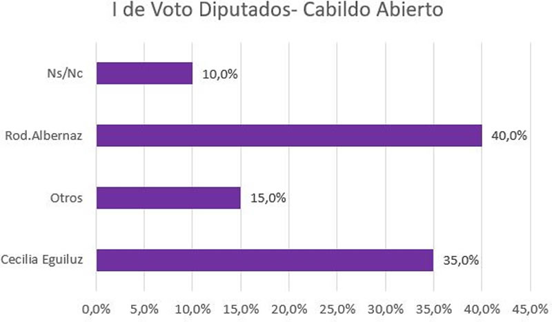 Aquí surgen con claridad y en disputa competitiva los nombres del actual diputado Rodrigo Albernaz con el 40% de la intención de voto y que seguramente intentará ser reelecto y Cecilia Equiluz con el 35% de la intención de voto. Eguiluz proviene del Partido Colorado donde ocupó diferentes cargos tanto ejecutivos como legislativos y desde hace un tiempo se ha sumado a las filas cabildantes. En el caso de este partido aparece un elevado número de simpatizantes que mencionan «otros» posibles candidatos, con el 15%, así como un 10% que no manifiesta preferencias al respecto.