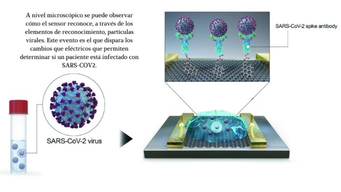 A nivel microscópico se puede observar como el sensor reconoce, a través de los elementos de reconocimiento, partículas virales. Este evento es el que dispara los cambios eléctricos que permiten determinar si un paciente está infectado con SARS-COV2