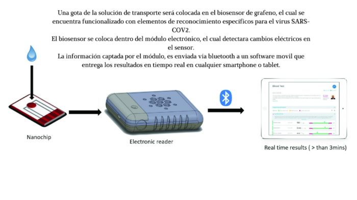 Se tomara un hisopado nasal para screening en pacientes asintomáticos. El hisopo se coloca en un tubo con una solución de transporte. Una gota de esta solución se pone en el biosensor de grafeno, el cual se encuentra funcionalizado con elementos de reconocimiento específicos para el virus SARSCOV2. El biosensor se coloca dentro del módulo electrónico, que detecta cambios eléctricos en el sensor. La información captada por el modulo es enviada vía bluetooth a un software móvil que entrega los resultados en tiempo real en cualquier smartphone o tablet.
