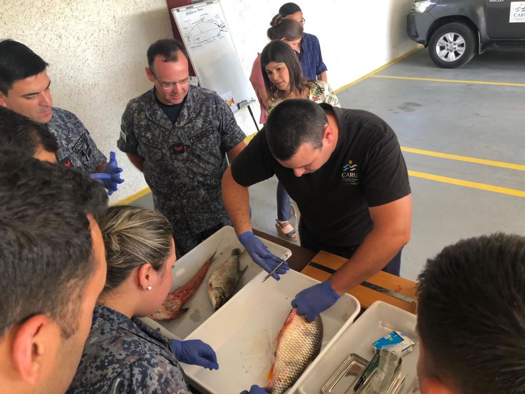 La Jornada tuvo como objetivo capacitar a personal de las Prefecturas de Argentina y Uruguay en las principales causas de mortandad de peces, así como crear una instancia de trabajo e intercambio de conocimiento sobre el procedimiento de CARU que se aplica en situaciones en que se verifiquen mortandad de peces y otros organismos acuáticos en el río Uruguay.