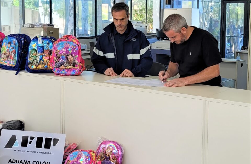 Ante una gestión conjunta realizada por la Municipalidad de Colón y AFIP-Aduana, días atrás se hizo efectiva la donación de un gran número de mochilas escolares en el marco de la Ley N° 25.603. La entrega tuvo lugar en instalaciones de la Aduana Colón donde el Intendente José Luis Walser recibió los elementos por un valor de más de 2 millones de pesos.