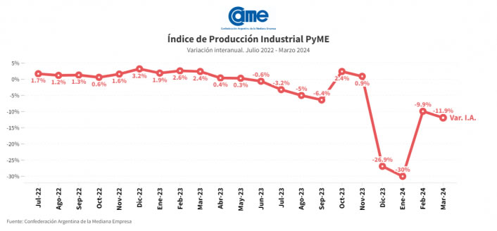 En marzo, la actividad del sector manufacturero pyme registró una caída anual del 11,9%, experimentando así un nuevo descenso. A su vez, en el primer trimestre del año, la producción industrial acumuló una baja del 19,1% en comparación con el mismo período de 2023.