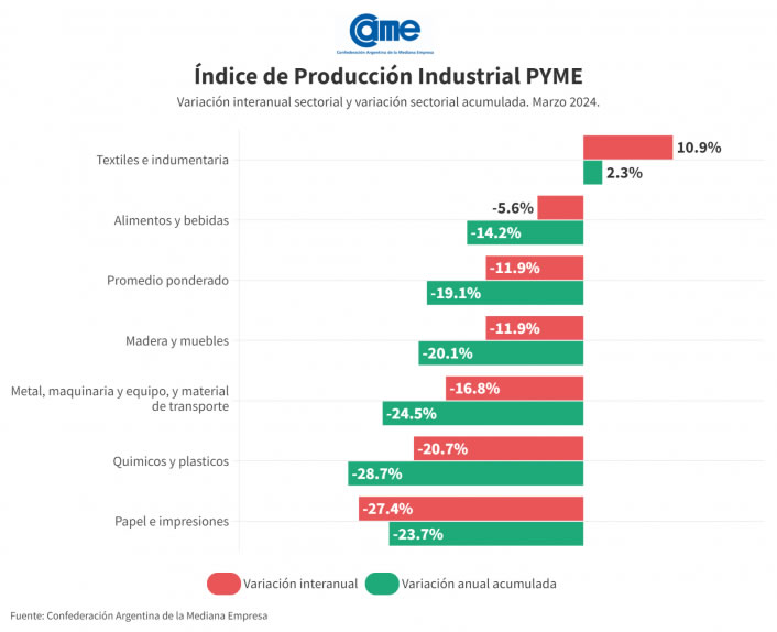 Cinco de los seis sectores manufactureros del segmento pyme tuvieron fuertes caídas en la comparación anual, siendo los más afectados “Papel e Impresiones” (-27,4%) y “Químicos y plásticos” (-20,7%). “Textil e indumentaria” fue el único rubro en alza (+10,9%).