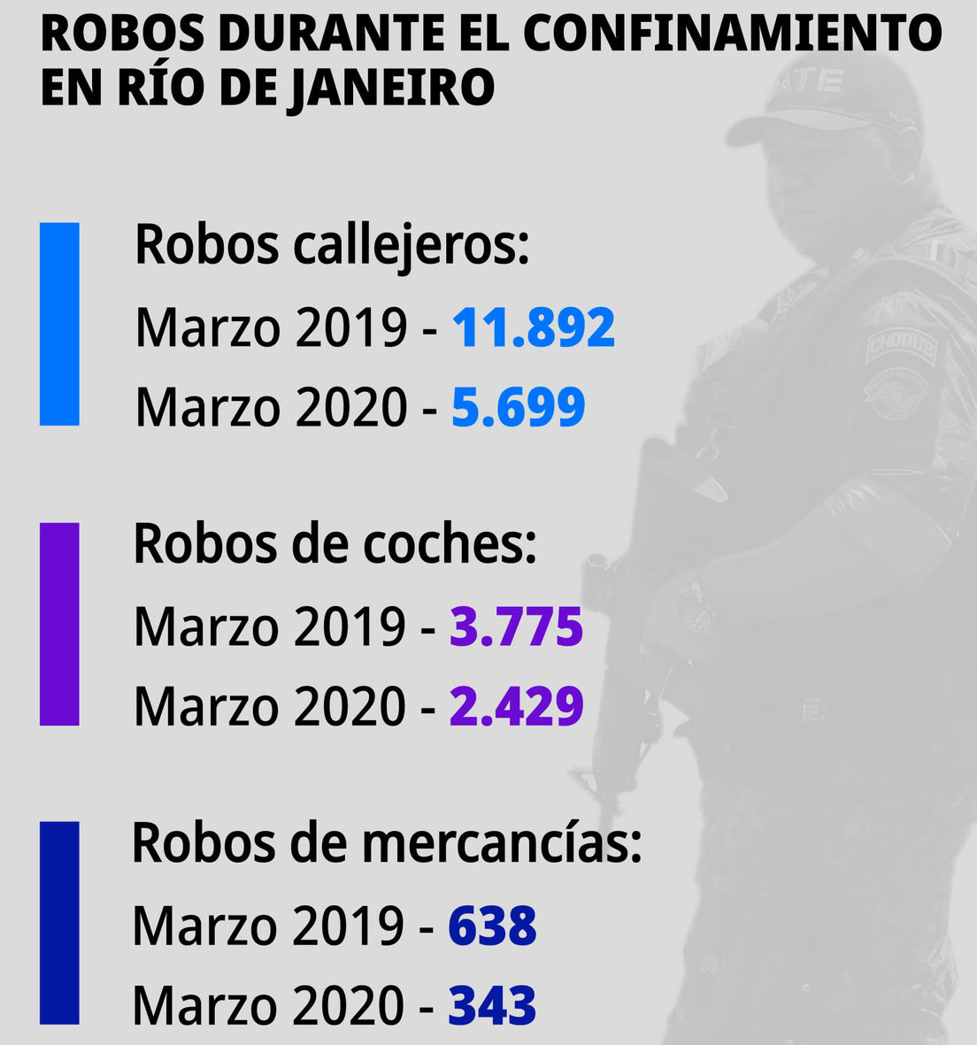 Como era de esperar, a menor cantidad de gente circulando en las calles menores índices de robos en todos los sectores. Comparando los datos de marzo de 2020 con marzo de 2019, el Instituto de Seguridad Pública de Río de Janeiro (ISP) muestra que en todo el estado los robos callejeros se han reducido a la mitad, así como el robo de mercancías –camiones con combustible y otros víveres suelen ser saqueados en sus rutas de transporte–, que también ha bajado un 50 %. El hurto de coches, aparcados o en circulación, se ha reducido en un tercio del total.