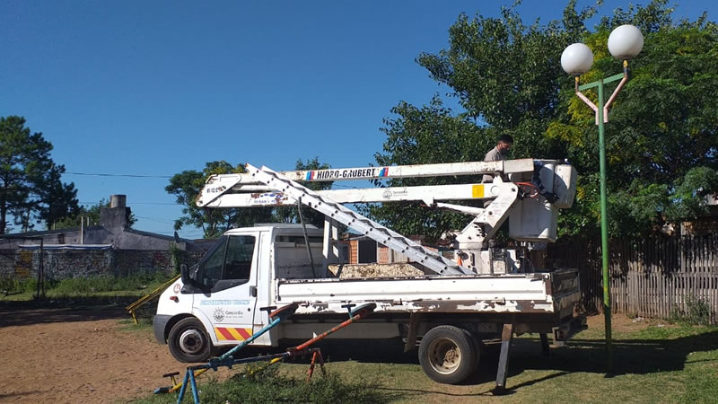 Estos trabajos se concretaron en la plazoleta del barrio José Hernández, barrio 8 de Diciembre, plazoleta Mariano Moreno, alumbrado en el Parque Mitre. También se trabajó en la reposición del cableado y mantenimiento del alumbrado en el polideportivo municipal.