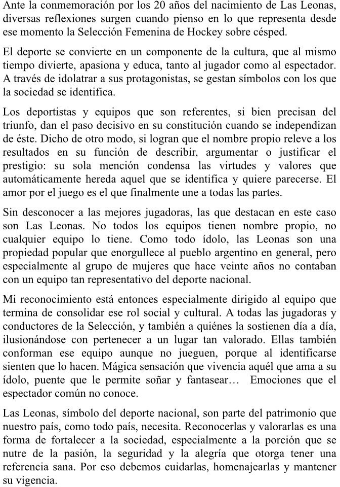En su carta, el entrenador expresó, entre otras cosas: «No todos los equipos tienen nombre propio, no cualquier equipo lo tiene. Como todo ídolo, Las Leonas son propiedad popular que enorgullece al pueblo argentino en general, pero especialmente al grupo de mujeres» que le dieron origen hace veinte años.