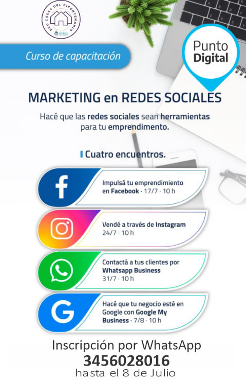 La red provincial de Puntos Digitales de Casa del Bicentenario ponen en marcha una instancia de capacitación virtual para emprendedores sobre Marketing en las Redes Sociales. El curso es dictado por profesionales del Punto Digital de Gualeguay y en Concordia se lleva adelante a través de la Casa del Bicentenario del barrio Sarmiento, en el marco de las políticas de articulación entre los Municipios de Concordia y Gualeguay.