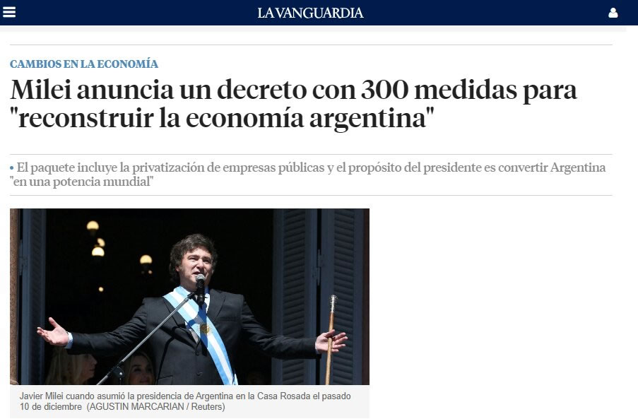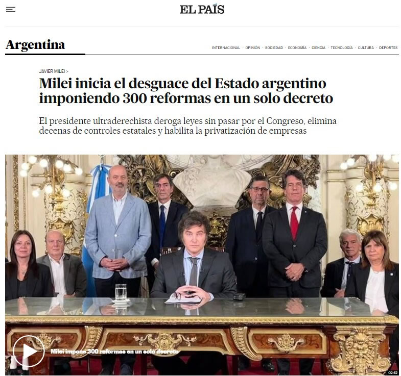 “Milei inicia el desguace del Estado argentino imponiendo 300 reformas en un solo decreto”, tituló el diario español El País, quien además señaló que “el presidente ultraderechista deroga leyes sin pasar por el Congreso, elimina decenas de controles estatales y habilita la privatización de empresas”.