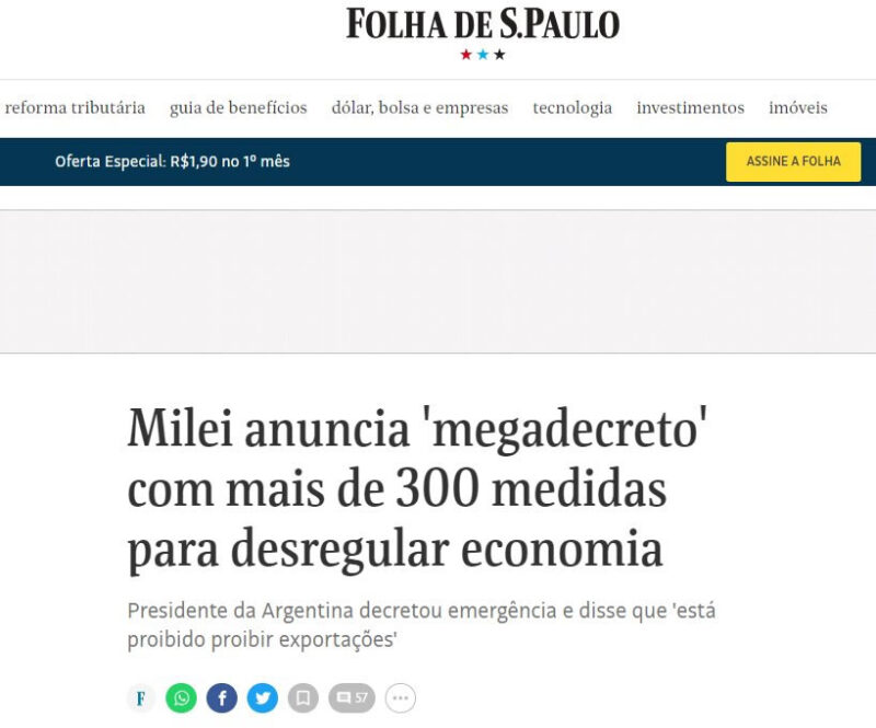 En Brasil, uno de los principales socios comerciales de Argentina, el Folha de Sao Paulo expresó: “Milei anuncia ‘megadecreto’ con más de 300 medidas para desregular la economía”, y agregó que el presidente argentino “decretó emergencia y dijo que ‘prohibir las exportaciones está prohibido’”.