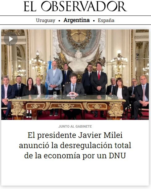 “El presidente Javier Milei anunció la desregulación total de la economía por un DNU”, tituló El Observador de Uruguay. “La norma abarca cuestiones como alquileres, privatizaciones, obras sociales y clubes de fútbol, entre muchas otras”, detalla el medio del país vecino.