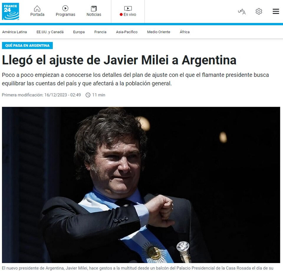 En Francia, el medio France24 puso: “Llegó el ajuste de Javier Milei a Argentina”. Y con un tono más sereno, escribió en la bajada: “Poco a poco empiezan a conocerse los detalles del plan de ajuste con el que el flamante presidente busca equilibrar las cuentas del país y que afectará a la población general”.
