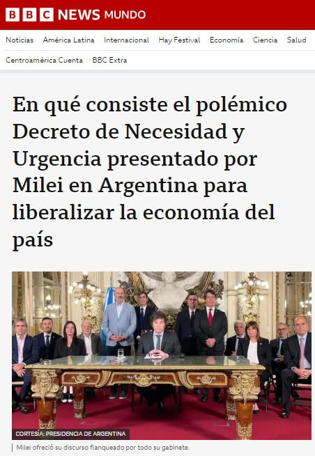 Por su parte, la BBC News de Reino Unido publicó el artículo: “En qué consiste el polémico Decreto de Necesidad y Urgencia presentado por Milei en Argentina para liberalizar la economía del país”.