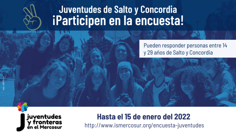 Hasta el 15 de enero del 2022, el Instituto Social del MERCOSUR y el Fondo de Población de las Naciones Unidas (UNFPA) invitan a adolescentes y jóvenes entre 14 y 29 años de las ciudades fronterizas de Salto (Uruguay) y Concordia (Argentina) a participar en la encuesta del proyecto “Juventudes y Fronteras en el MERCOSUR”.