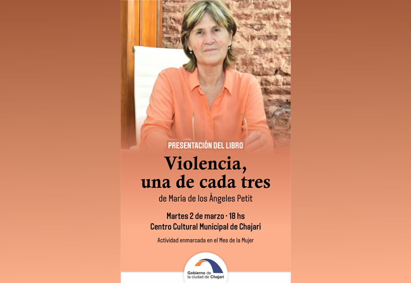 En el marco de las actividades organizadas por la Municipalidad de Chajarí para el Mes de la Mujer, el martes 2 de marzo a las 18 hs. en el Centro Cultural, la Dra. María de los Ángeles Petit presentará su libro VIOLENCIA: UNA DE CADA TRES, dando inicio a las actividades programadas por el Municipio.