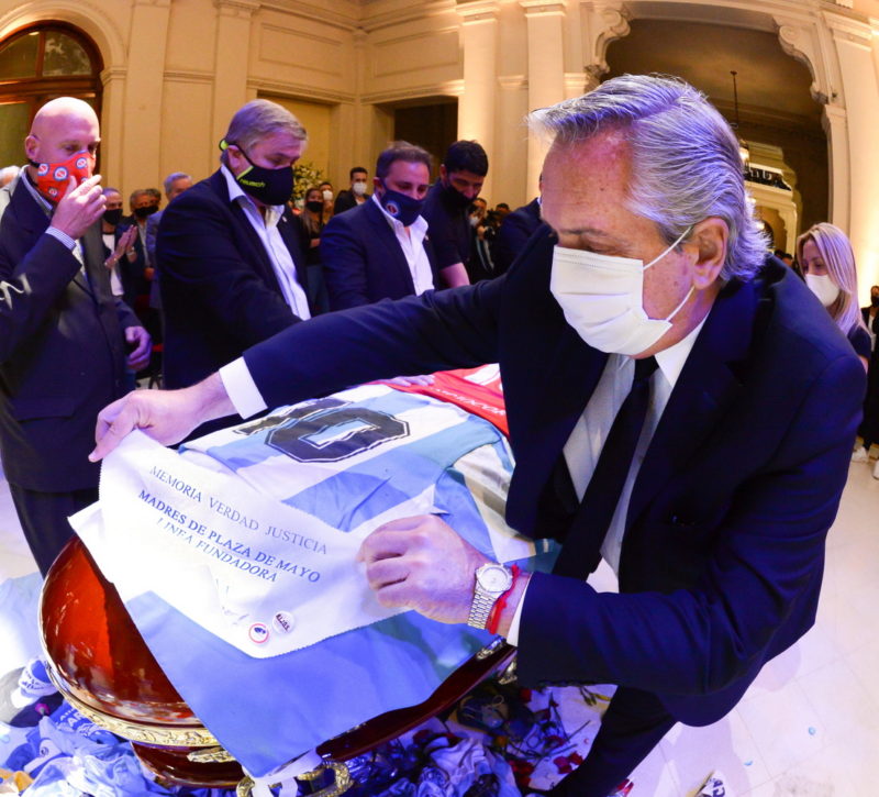 Cerca de las 11:00 a.m., hizo su ingreso el presidente Alberto Fernández, quien luego de saludar a la familia, visiblemente conmovido, depositó sobre el féretro una casaca de Argentinos Juniors, equipo del que es hincha y en el que debutó Maradona a los 17 años; así como dos pañuelos que simbolizan a las Madres y Abuelas de Plaza de Mayo.
